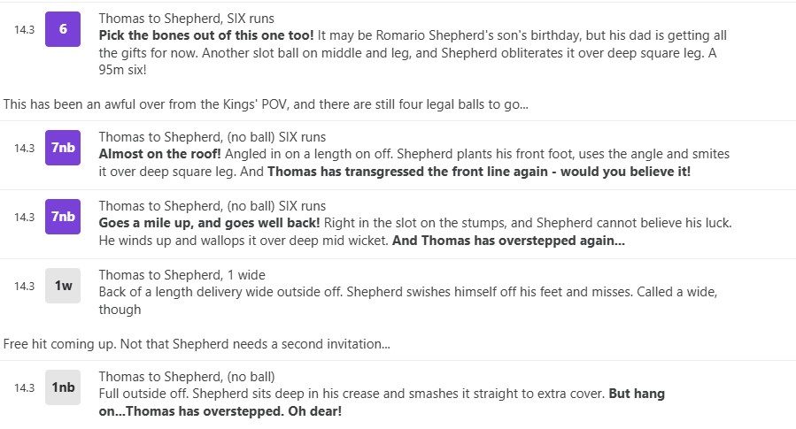 আবার একটি ‘ফ্রি হিট’ এবং আরও একটি ছয় মারেন শেফার্ড। ‘ফ্রি হিট’-এর তৃতীয় বলটিও ‘নো’ হয়। সেই বলেও ছক্কা হাঁকান শেফার্ড। প্রতি বারই থমাসের পা ক্রিজের বাইরে পড়ায় আম্পায়ার ‘নো বল’ দিয়েছেন। ফলে তিনটি ছয়ের মধ্যে মাত্র একটিই বৈধ বল ছিল।  ১টি বৈধ বল থেকেই আসে রেকর্ড ২২ রান! বলটি তিনি শেষ করেছেন এভাবে নো, ওয়াইড, নো ৬, নো ৬, ৬।